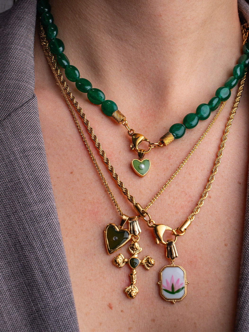 Realizzato in acciaio inossidabile con una delicata placcatura in oro 18 carati, questo ciondolo combina resistenza e raffinatezza. La finitura dorata dona una lucentezza calda e luminosa che valorizza ogni dettaglio del gioiello.