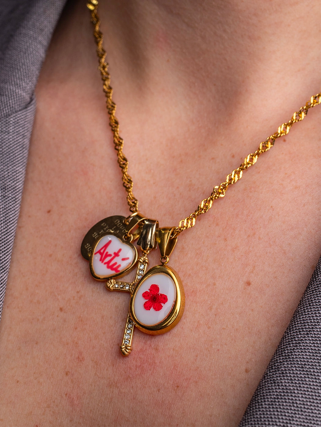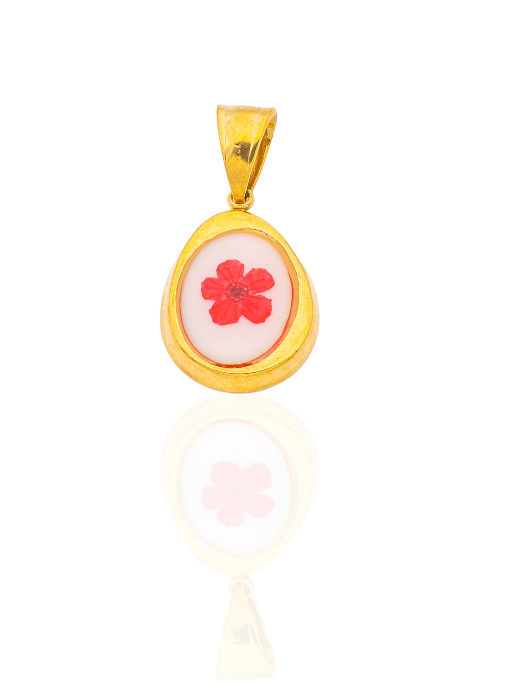 Il ciondolo presenta uno splendido fiore vero incastonato, impreziosendolo con eleganza.