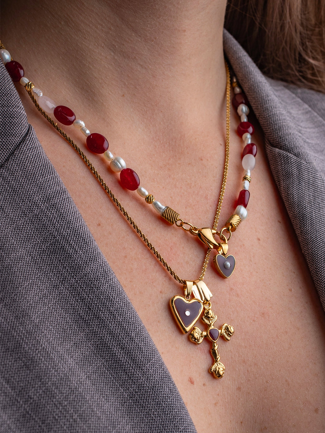 Questo collier è realizzato con delicate pietre avventurina rossa e rosa, perle di fiume e acciaio inossidabile placcato in oro 18 carati, un connubio che unisce eleganza e resistenza. La finitura dorata valorizza le tonalità naturali della giada, donando al gioiello un fascino raffinato e duraturo.