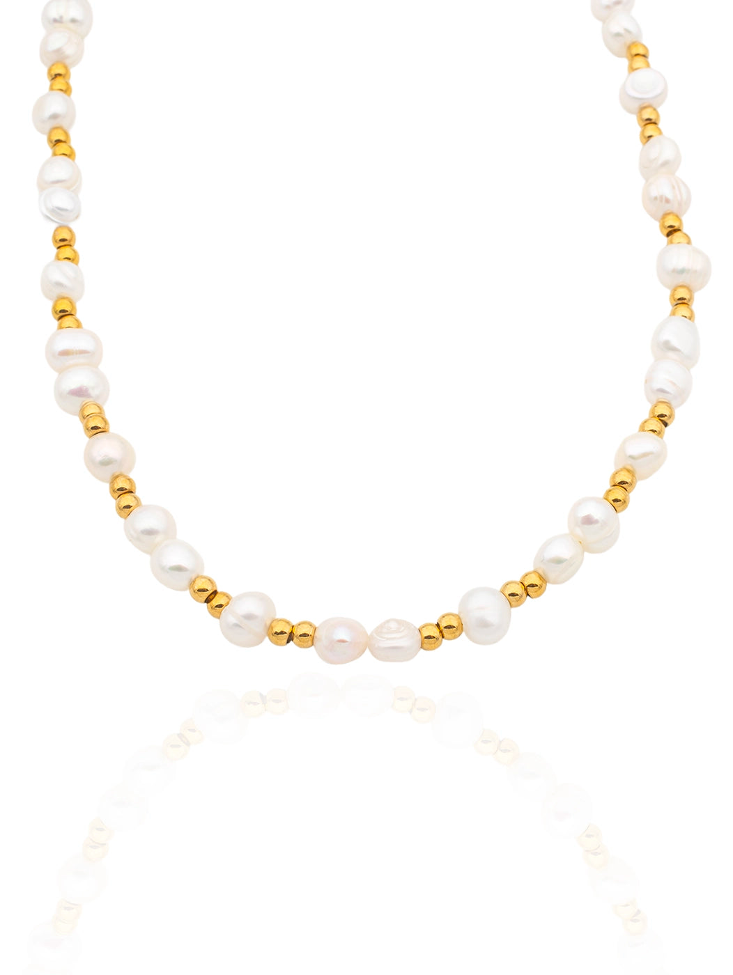 Questo colier Ephyra è un gioiello di eleganza e precisione artigianale. Le perle di fiume vere sono alternate a sfere in acciaio inossidabile placcate in oro 18k, per un tocco di lusso senza tempo. Ogni pezzo è realizzato interamente a mano, garantendo un design unico e di alta qualità.
